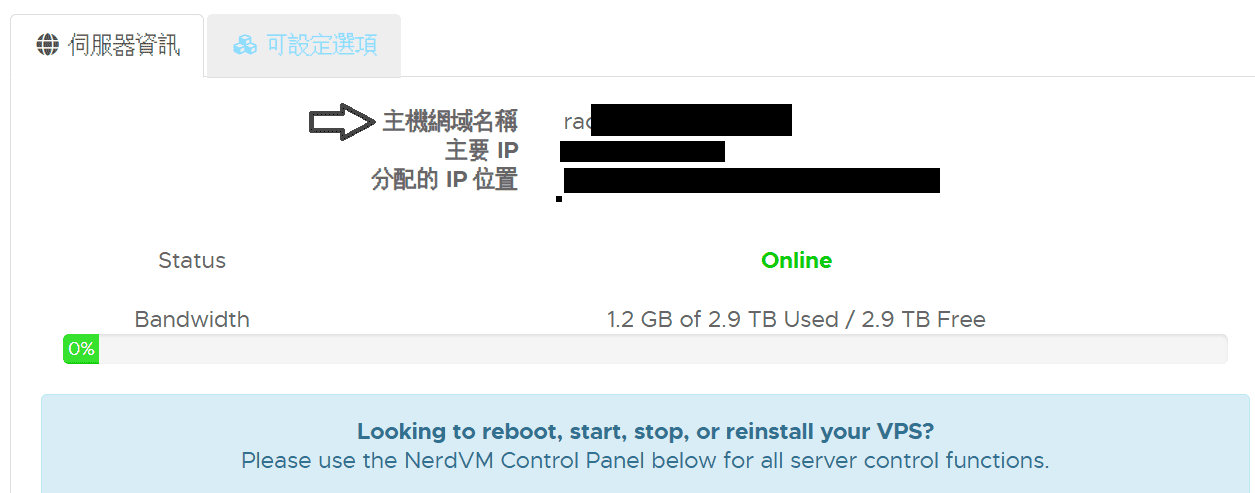 其中的主机名,你可以在主机的管理页面的“Server Information”或者“伺服器資訊”看到,叫“hostname”或者“主機網域名稱”,IP也在这里看