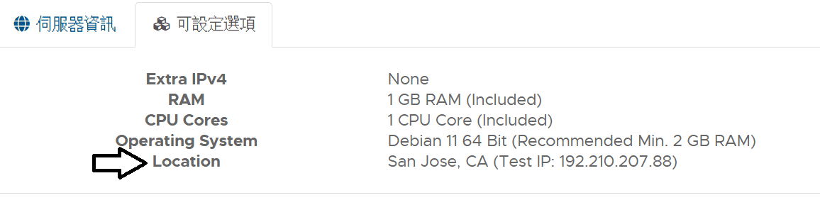 至于机房位置嘛,点击旁边的”Configurable Option”或者”可設定選項”可以看到”Location”也就是机房位置