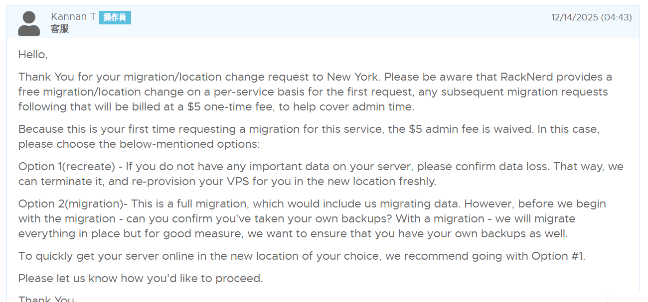 RackNerd每台机器都有一次免费的迁移机房次数,之后每次迁移需要收五美元管理费,服务器迁移后IP会重置