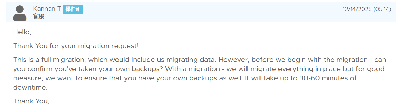 - Option 2(完整迁移),选择Option 2,操作员会手动把你旧机房的VPS复制到新机房,你不会损失任何数据,迁移后除了IP重置不会有其他任何改变,代价是耗时较长,选择完整迁移大概要30~60分钟完成